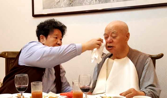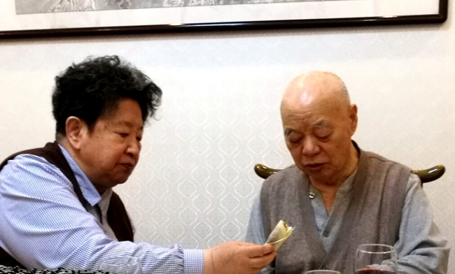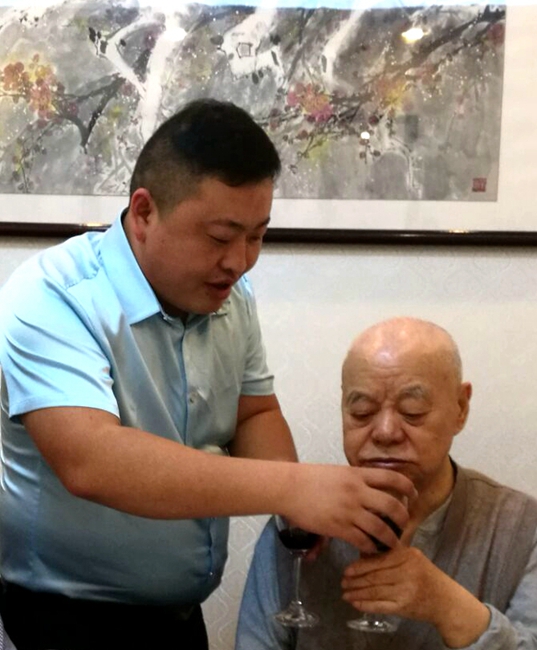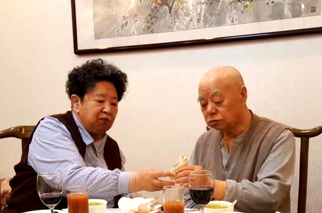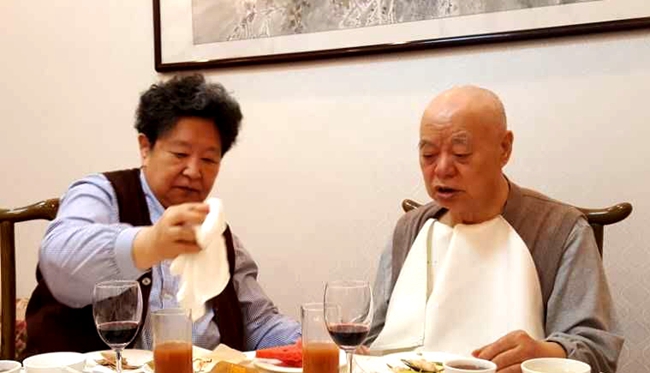 席间,由于王景清身体正在恢复期间,只能左手拿匙子吃饭,动作有些缓慢,李讷老人几次为王老夹菜,擦掉嘴边沾着的汤汁,尽管王老有随从人员的照顾,李讷依旧很细心的照顾着王老。我们被老两口相濡以沫的情怀感动,用手机拍下了这感人的一幕。我们频频为老人举杯,祝两位老人身体健康,长寿超百岁。